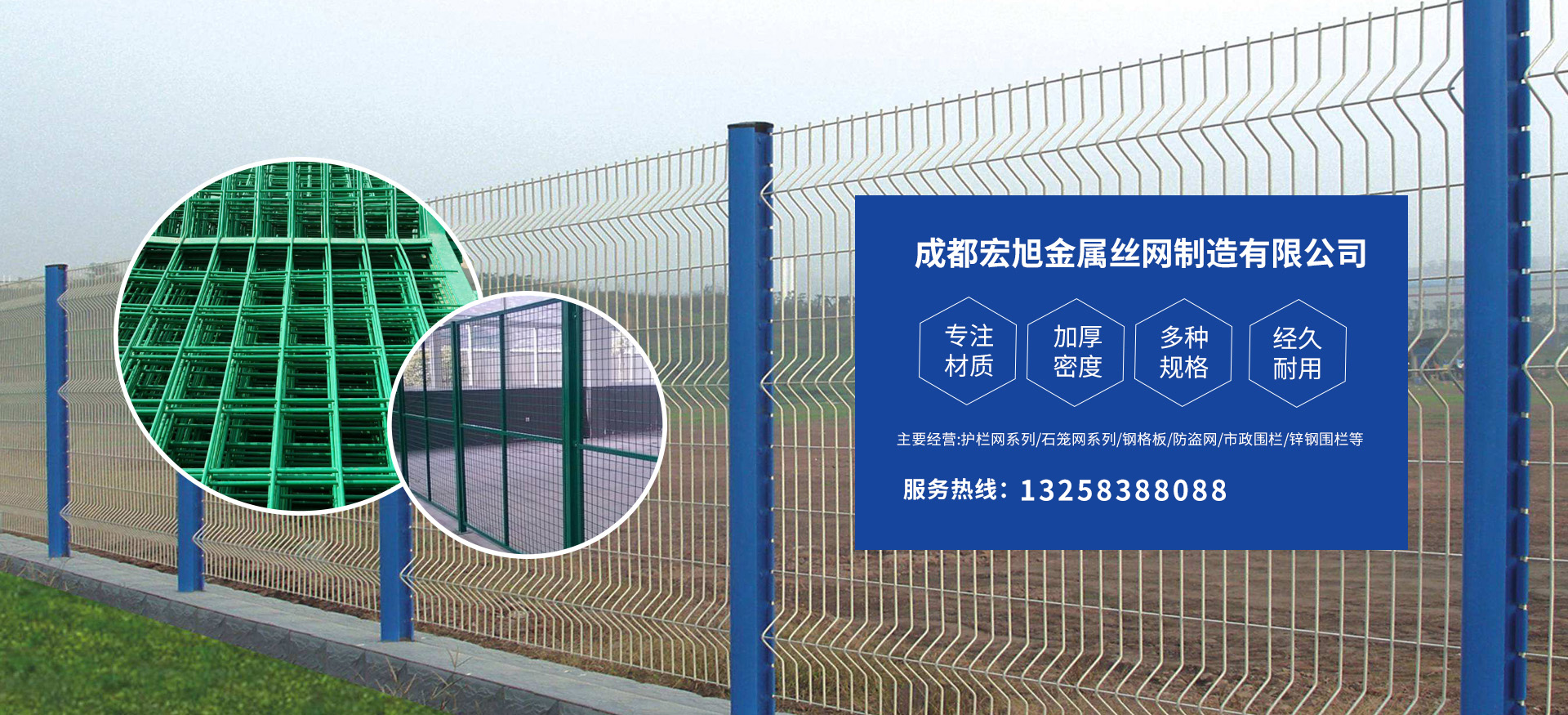 成都宏旭金屬絲網(wǎng)制造有限公司主營護欄網(wǎng)系列、石籠網(wǎng)系列、鋼格板、防盜網(wǎng)、市政圍欄、鋅鋼圍欄、鋼筋網(wǎng)片、聲屏障系列、波形護欄板、柔性纜索護欄、SNS邊坡防護網(wǎng)等其他絲網(wǎng)類產(chǎn)品。特殊規(guī)格可加工定做,也可根據(jù)客戶來圖來樣定做。自創(chuàng)業(yè)以來,公司一直堅持市場為導向,以客戶為根本,以實業(yè)為基礎(chǔ),以技術(shù)為支持,以科研為后盾,集科研、生產(chǎn)、經(jīng)營為一體,不斷研制開發(fā)新產(chǎn)品,開拓市場,走綜合發(fā)展之路。多年來,公司憑借過硬的質(zhì)量,良好的信譽、優(yōu)質(zhì)的服務、合理的價格,贏得了市場和商家的一致好評。